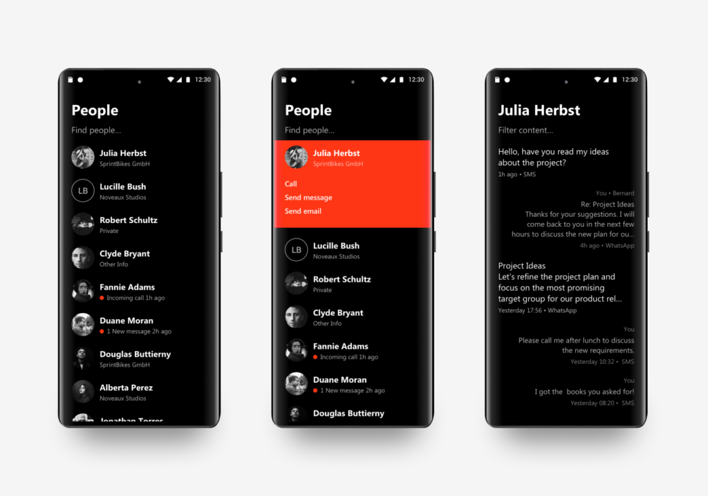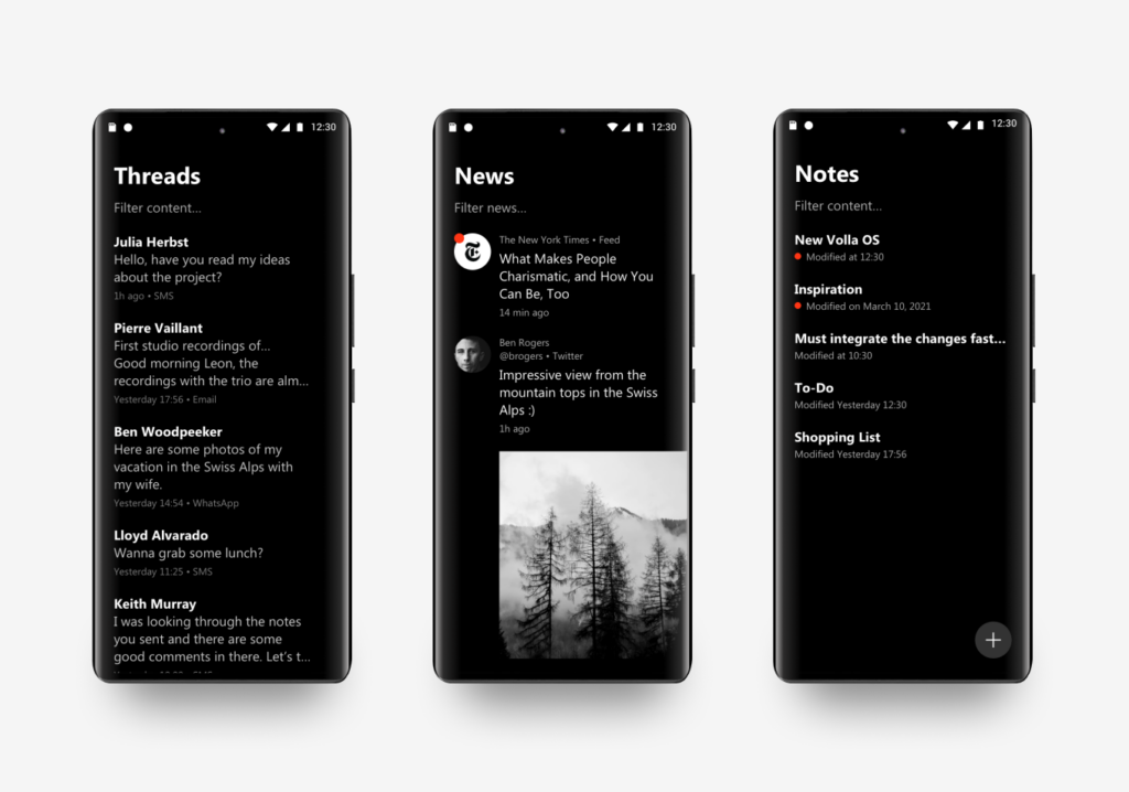 Volla OS stellt für Sie automatisch und dynamisch Ihre jüngsten Kontakte zusammen, mit denen Sie zuletzt durch einen Anruf oder Nachricht in Verbindung standen, Ihre jüngsten Unterhaltungen, egal ob SMS, Signal oder Volla Messages, die jüngsten Nachrichten Ihre abonnierten Nachrichtenkanäle oder Ihre Notizen, die wichtigsten oben angeheftet. Regieren Sie direkt auf eine Nachricht oder lesen Sie einen spannenden Artikel in einer bereinigten, lesefreundlichen Ansicht, ohne eine App öffnen zu müssen. Das ist das Konzept von Volla OS. Menschen und Inhalte stehen im Mittelpunkt.
